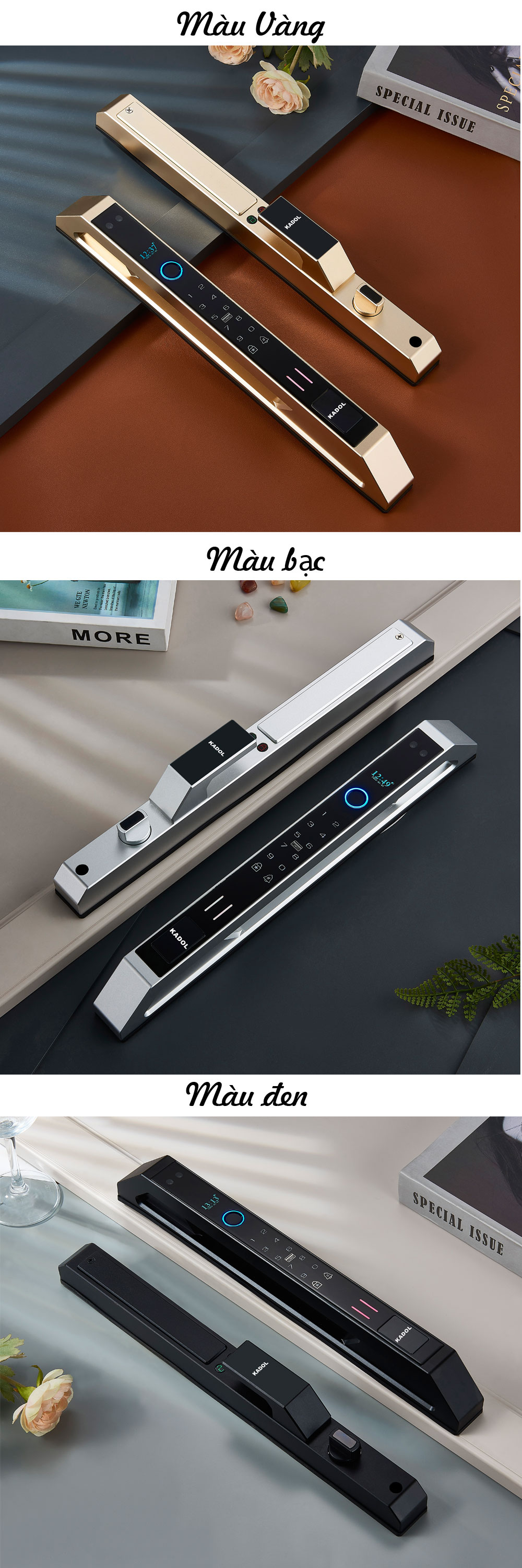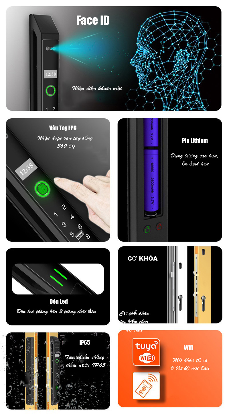 Chức năng mở khóa: Khuôn mặt, vân tay, Mật Mã, Thẻ Từ, Chìa Cơ, Mở từ xa qua điện thoại,