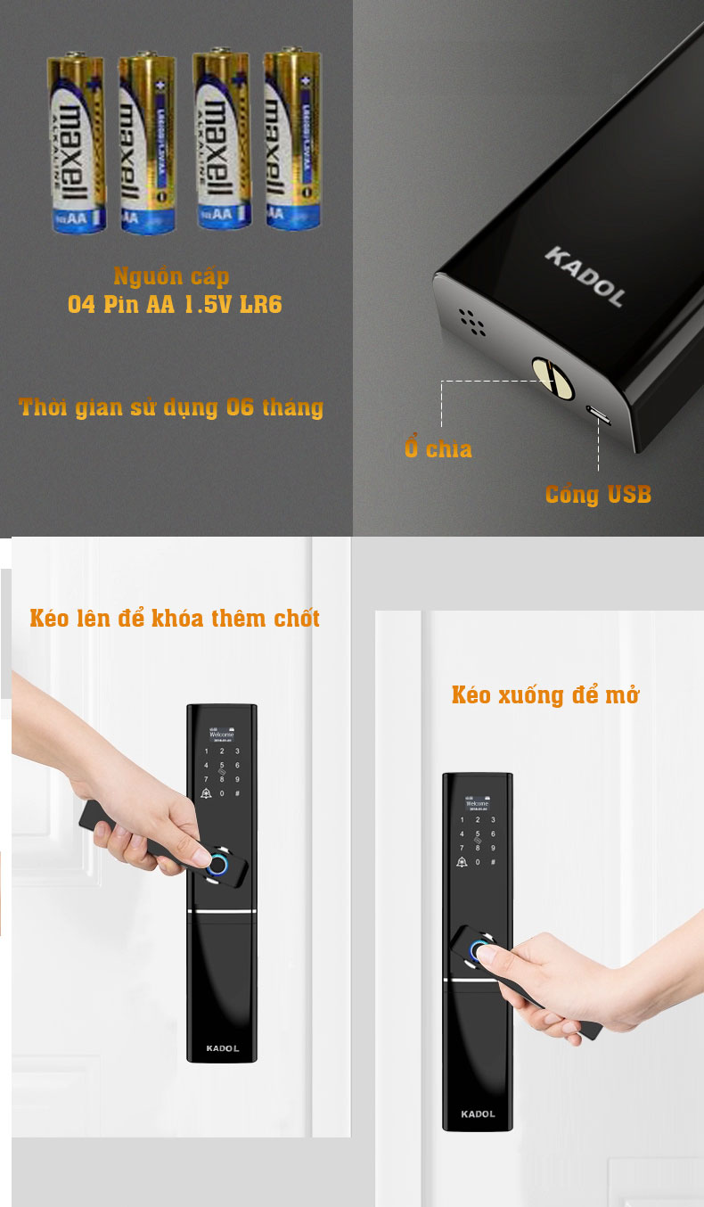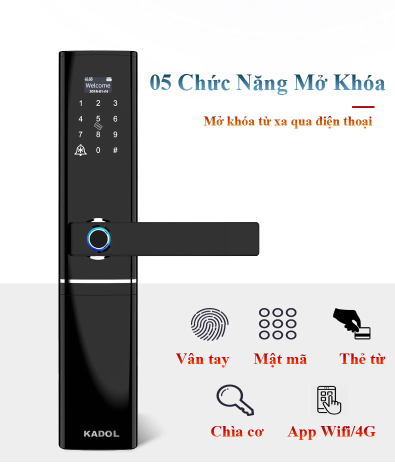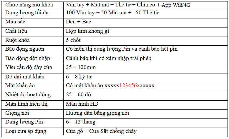 | Chức năng mở khóa: | Vân tay, mật mã, thẻ từ, chìa cơ, mở từ xa, cấp mã từ xa bằng app Tuya trên điện thoại |